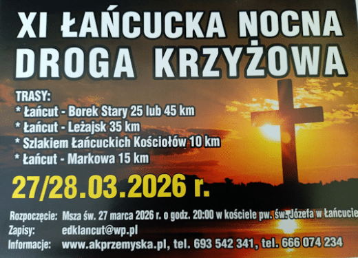 Zaproszenie do uczestnictwa w XI Łańcuckiej Nocnej Drodze Krzyżowej 27 marzec 2026 r. Zapraszam wszystkich chętnych do udziału w XI Łańcuckiej Nocnej Drodze Krzyżowej. W obecnym roku przygotowaliśmy pięć tras do wyboru: – dwie doCzytaj dalej