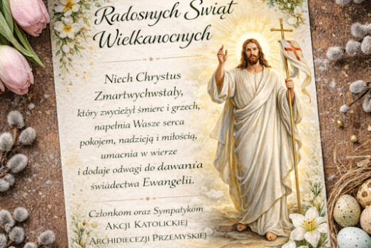 Z okazji Świąt Zmartwychwstania Pańskiego składamy najserdeczniejsze życzenia Członkom oraz Sympatykom Akcji Katolickiej Archidiecezji Przemyskiej. Niech Chrystus Zmartwychwstały, który zwyciężył śmierć i grzech, napełnia Wasze serca pokojem, nadzieją i miłością. Niech światło pustego grobu rozpraszaCzytaj dalej